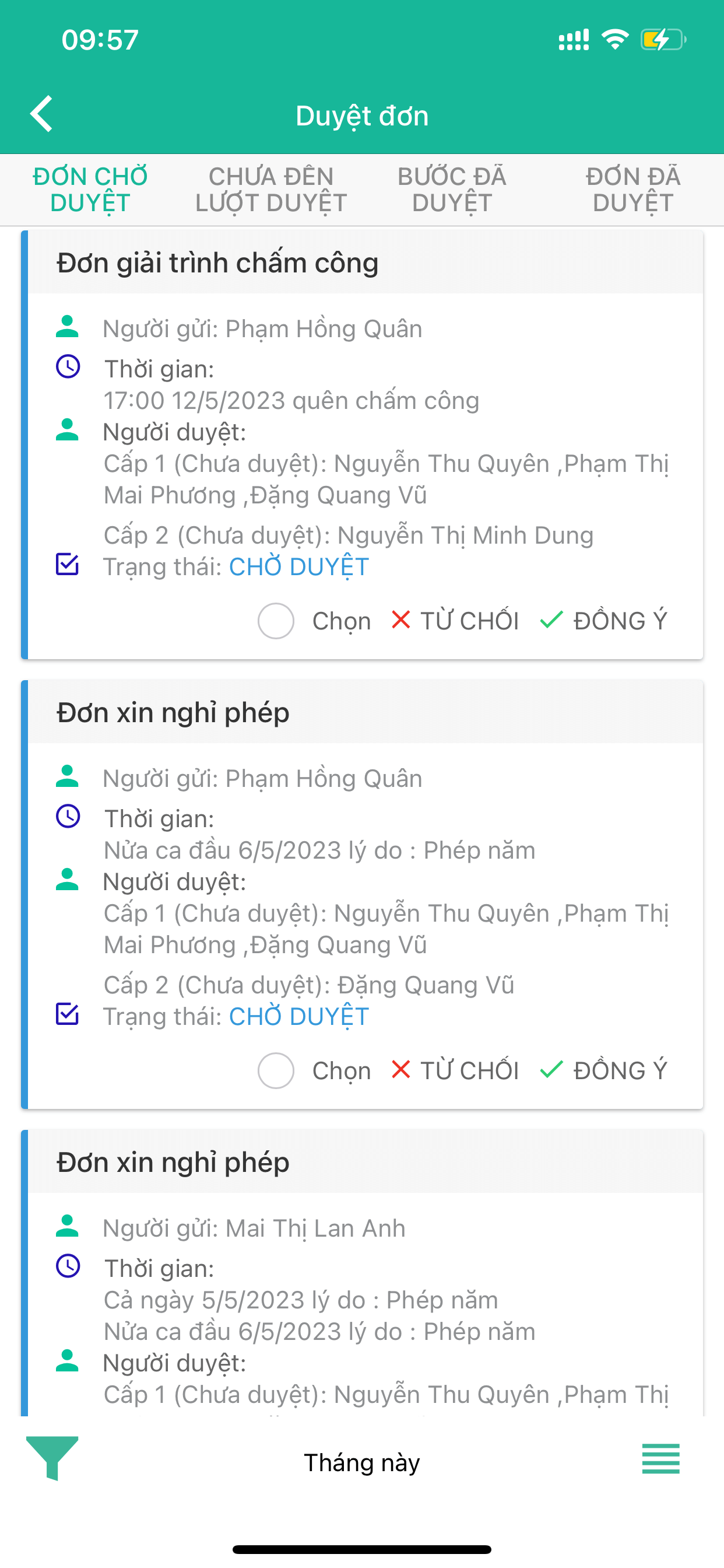 - Lưu ý: Nếu không thấy đơn cần duyệt bạn thực hiện chọn vào bộ lọc để lọc theo thời gian/phòng ban