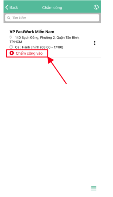 Chấm công tại văn phòng nhanh chóng: Đối với những nhân viên làm việc tại một địa điểm cố định như văn phòng sẽ thực hiện chọn địa điểm chấm công là địa chỉ văn phòng làm việc và bật GPS để thực hiện chấm công.