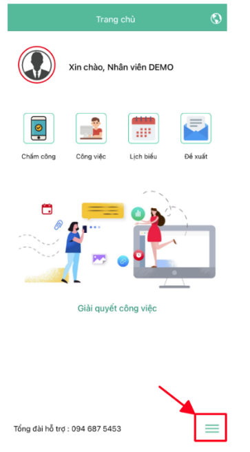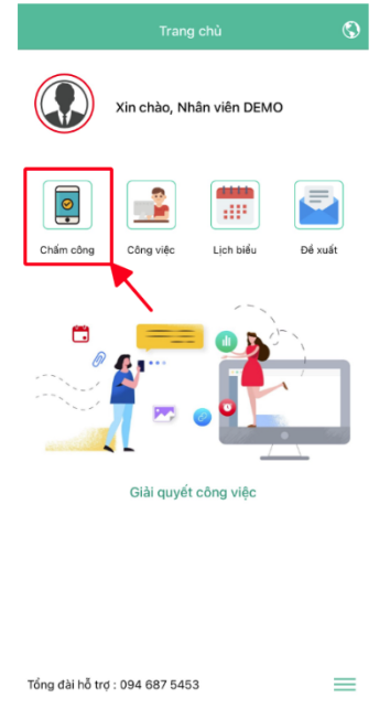 - Bước 1: Từ màn hình giao diện chọn CHẤM CÔNG