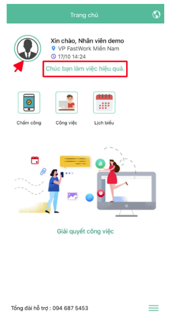 - Bước 4: Kiểm tra chấm công vào thành công sẽ có dòng chữ “Chúc bạn ngày làm việc hiệu quả” và vòng tròn avatar chuyển thành màu xanh