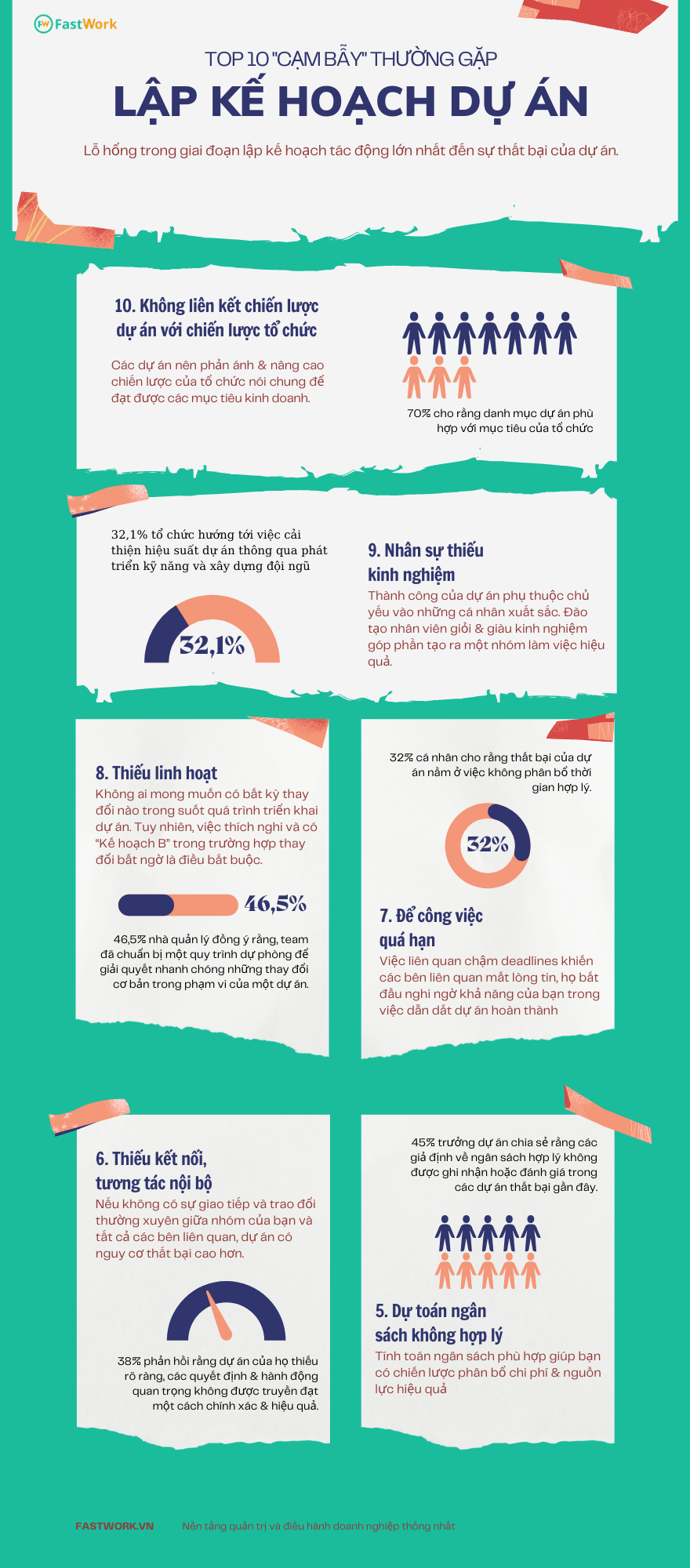 Số 10 trong danh sách này là sự thiếu đồng bộ giữa chiến lược chung của dự án với chiến lược riêng của nhóm. 70% trưởng dự án cho rằng các dự án nên phản ánh & mở rộng so với mục tiêu của team bởi nó ảnh hưởng trực tiếp đến hiệu quả hoạt động & kết quả kinh doanh của doanh nghiệp.