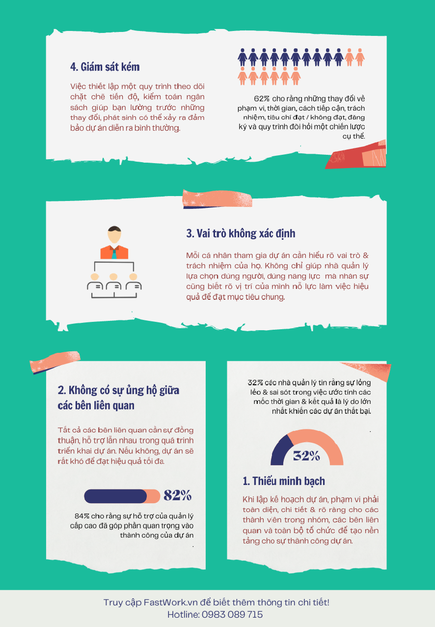 Một kế hoạch rõ ràng từ phạm vi công việc, vai trò & quyền hạn của từng cá nhân, các bên liên quan & cả tổ chức là nền tảng cho sự thành công dự án. 32% các nhà quản lý tin rằng sự lỏng lẻo & sai sót trong việc ước tính các mốc thời gian & kết quả là lý do lớn nhất khiến các dự án thất bại.